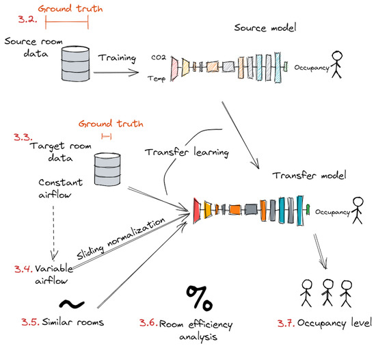 The analysis of the proposed methodology is divided into six parts, which can be followed from the flowchart in Figure 4 and are described in the following sections. In Section 3.2 the source CDLSTM occupancy detection model was trained using data with long occupancy ground truth. In Section 3.3, a pretrained source model was transferred to a target room in a different environment with minimal occupancy ground truth data for model retraining. In Section 3.4, the operation of the ventilation system has experienced a change and the target detection model created in the previous part is used with the input data normalized using a sliding window to retain the performance. In Section 3.5, a target model’s performance is checked on the data from two similar rooms from the same building. In Section 3.6, the room efficiency is analysed to present the importance of occupancy information and at the same time the performance of the target model is interpreted. Finally, in Section 3.7, the transfer methodology is attempted predicting the room occupancy level.