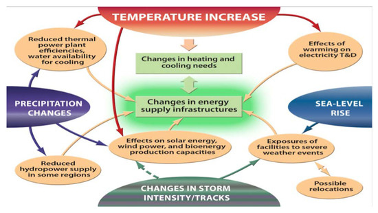 One of the most extensive and most critical slow-onset hazards is climate change. There is a natural tendency to change climate, and in the last decades, there was a strong human influence by CO2 emissions. According to the latest Intergovernmental Panel on Climate Change (IPCC) report, increasing air temperature is inevitable [7]. The question is, how much will it increase, and with what consequences? Except for widely known consequences, such as ice melting and rises in sea levels, climate change may lead to changes in cyclone activity and its track changes. Continued global warming leads to an increase in the frequency and intensity of heavy one-day precipitation. This means that severe daily storms will increase in intensity and frequency. At the same time, the increase in frequency and intensity of drought events is possible as well. According to some scenarios, it is very likely that rainfall variability related to the ENSO oscillation will be amplified by the second half of the 21st century [7]. Observing the overall situation, climate change will lead to changes in the frequency and intensity of all meteorological parameters. At one location, the changes will be more favorable for power plant exploitation, while at another location, they will lead to enormous floods and damage. The expectation is that photovoltaic output will increase in Greece [32] and that the intensity of Mediterranean hurricanes (Medicanes) will increase as well [33]. The general influence of global warming on the power system is explained in the scheme depicted in Figure 2 [34]. In future research, an overall projection of the influence of climate change on each power system segment, from infrastructure through to supply and demand to the market, should be done.