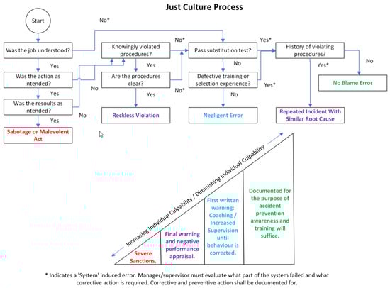 - Just Culture—an organizational atmosphere of trust. People are encouraged to provide essential safety-related information. However, it should be clear where the line is between acceptable and unacceptable behavior. For a better understanding, the Just Culture Process requires promptly developed procedures and instructions that personnel must follow. The process is shown in Figure 3 [6].