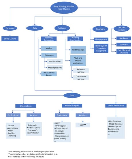 There is no warning system without timely, relevant, and accurate data. Data are necessary to research the weather influence in the past and recognize possible weather hazards in the present and the future. Measurements and/or observations ensure checkups of the real or near-real weather situation. Observations can be meteorological (e.g., type of cloud observation) and others (e.g., fire and flood events observation). Model products ensure the forecast or checkup of a future situation. A combination of measurements, observation, and model products enables a hazard assessment. Data can be provided by professionals, amateurs, and laypeople. It is crucial to establish excellent cooperation with amateurs and laypeople and encourage them to send information to the early warning system database. In sudden and fast severe weather events (e.g., such as a waterspout), there is a possibility that information provided by customers will be the only available data. More data information is provided in Section 4.1.