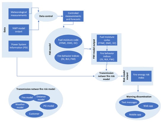 The overall early warning weather hazard system contains weather forecast and risk prediction for all possible weather hazards for the area of interest (e.g., heat and cold waves, different types of storms, floods, forest fires, strong winds, etc.). The scheme of the early warning hazard system is presented in Figure 4, and the example of calculating the risk index is proposed in Section 5.1. The proposed risk index is based on weather and power system information. It is adjusted to predict possible fire influence on the power system with an emphasis on the transmission network. The main segments of the proposed early warning system are personnel, data, software, hardware, and the backup system.