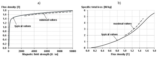 Table 1 gives the catalog values of guaranteed and typical magnetizability, while Table 2 gives analogous values of the specific loss of these sheets at a frequency of 50 Hz, according to European Standard EN 10106. The measurements of magnetic properties were performed on a 25 cm Epstein frame system according to the IEC 60404-2. Half of the sample strips are taken in the rolling direction and half in the transverse direction. Samples are not stress relief annealed after shearing [38].