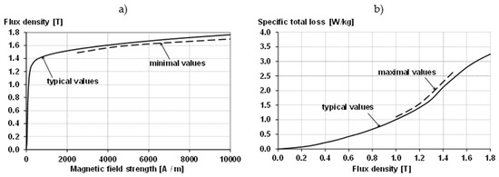 Guaranteed (minimal) and typical magnetizability (a) and specific total loss (b) of electrical sheet M470-50A at 50 Hz, according to European Standard EN 10106.