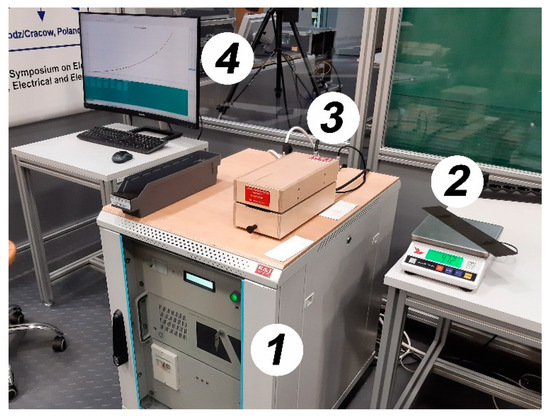 Experimental setup for testing laminations’ parameters; 1—power electronic module, 2—weighing machine with the tested strip, 3—measurement yoke, 4—LCD of the measuring computer.