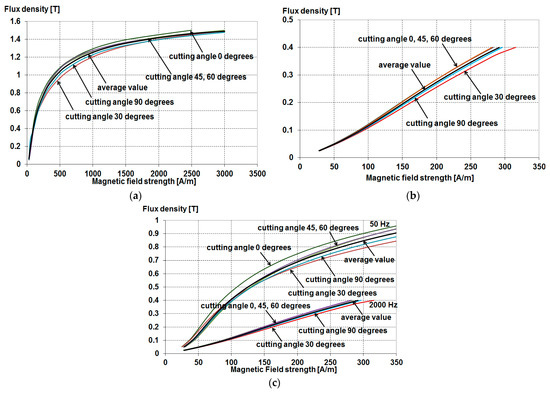 Figure 5 shows an example of the measured magnetization characteristics of the M470-50A sheet with a thickness of 0.5 mm for samples with a width of 5 mm cut with a guillotine at different cutting angles in relation to the rolling direction of the sheet, for frequencies of 50 Hz and 2000 Hz.