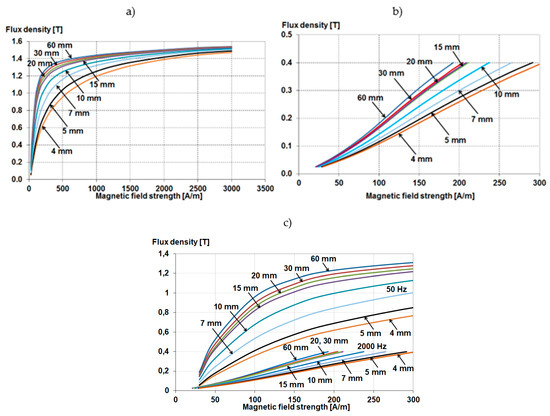 As shown in Figure 5, the influence of the sample cutting angle on the magnetization characteristics is small (not exceeding 4% according to the mean value in the range of magnetic field strength from 1000 to 2500 A/m at the frequency of 50 Hz). At the frequency of 2000 Hz, the relative deviation in flux density for the mean values in the range of magnetic field strength from 40 to 280 A/m does not exceed 7%, which indicates the possibility of using the averaged magnetization characteristic for this frequency. Thus, in practice, it is possible to use the average characteristic, determined either for all cutting angles or for 0 and 90 degrees angles with respect to the rolling direction of the sheet. Later in the article, the magnetization characteristics averaged for all angles are presented. Figure 6 presents examples of the measured average for all angles of the M470-50A sheet’s magnetization characteristics with a thickness of 0.5 mm for samples cut with a guillotine of various widths, for frequencies of 50 Hz and 2000 Hz.