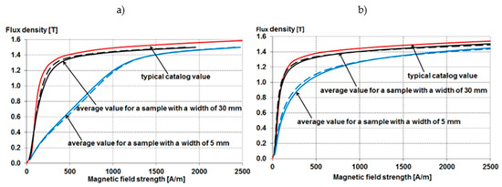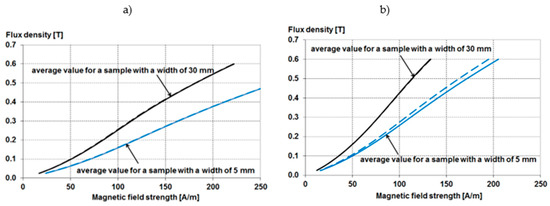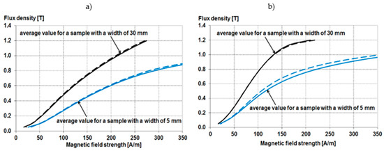 The magnetization characteristics for 50 Hz for samples cut with a guillotine 5 mm and 30 mm wide for M470-50A (a) and M270-35A (b); characteristics averaged for all angles (solid line) and 0 and 90 degrees (dashed line).