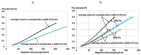 Based on Figure 6, it can be concluded that the magnetization characteristics strongly depend on the width of the sample and deteriorate with the reduction in the sample width, especially in the range of smaller induction. These discrepancies increase with increasing frequency. The observed phenomenon results from the destruction of a part of the material structure. For a frequency of 50 Hz, it can be assumed that the characteristics will converge for increasing induction values.