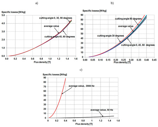 Figure 11 shows an example of the measured loss characteristics of the M470-50A sheet with a thickness of 0.5 mm for samples with a width of 5 mm cut with a guillotine at different cutting angles in relation to the rolling direction of the sheet, for frequencies of 50 Hz and 2000 Hz.