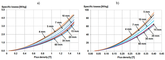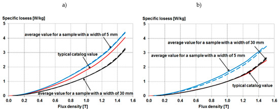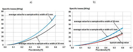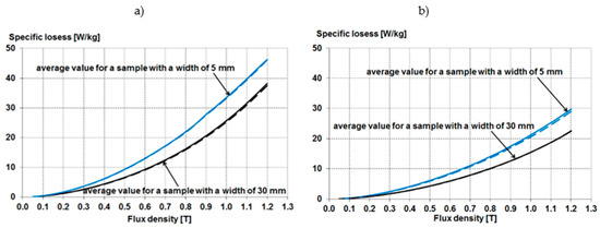 As can be seen from Figure 13, Figure 14, Figure 15 and Figure 16, similarly to the magnetizability characteristics, for samples with a larger width, the specific losses’ characteristics averaged for all angles practically coincide with the average characteristics for 0 and 90 degrees angles. Certain discrepancies between these characteristics occur for samples of small width, especially for thinner sheet metal. Still, they are so slight that, in practice, the influence of the sample cutting angle can be neglected when determining the loss curve. However, the width of the samples is essential as it should correspond to the width of the individual elements of the machine’s magnetic circuit.