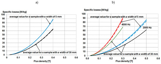 The average specific losses of M470-50A sheet for samples of different widths cut with a guillotine, for frequencies of 50 Hz (a) and 2000 Hz (b).
