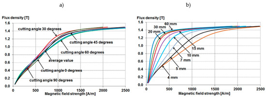 The magnetization characteristics of M470-50A sheet for samples cut with a laser with a width of 5 mm at various cutting angles (a) and average magnetization characteristics for samples of various widths (b), for the frequency of 50 Hz.