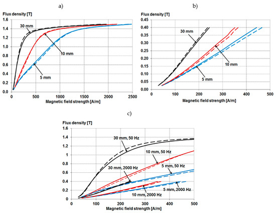 The magnetization characteristics for 5 mm, 10 mm, and 30 mm wide laser-cut samples made of M470-50A electrical sheet at 50 Hz (a) and 2000 Hz (b) and both frequencies on one graph (c); characteristics averaged for all angles (solid line) and 0 and 90 degrees (dashed line).