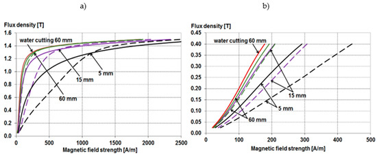 The magnetization characteristics measured and averaged for all angles (solid line) and 0 and 90 degrees (dashed line) for samples made of the M470-50A sheet with various laser-cut widths, for frequencies of 50 and 2000 Hz, are shown in Figure 18.
