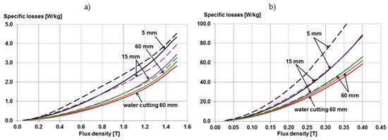Figure 20 shows the averaged loss characteristics at frequencies of 50 Hz and 2000 Hz for samples of different widths made of M470-50A sheet metal, cut using other technologies. Additionally, in this case, the loss characteristics are given for a 60 mm wide sample cut with water.