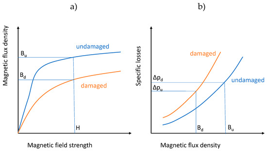 Characteristics of magnetization (a) and loss (b) of undamaged and damaged electrical sheet due to punching.