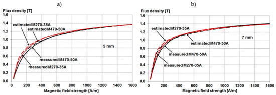 Moreover, a simplified method of determining substitute material characteristics for samples of different widths was proposed based on the measurement results obtained for a sample with a small width (not exceeding 4 mm), cut with a die, and the sample with a width of 60 mm, cut with water. It was verified by measurement for samples with a width not exceeding 10 mm (which corresponds to the dimensions of the magnetic core elements of low and medium power motors), mechanically cut for frequencies of 50 Hz and 2000 Hz, made of both M470-50A sheets with a thickness of 0.5 mm and from M270-35A sheets with a thickness of 0.35 mm.