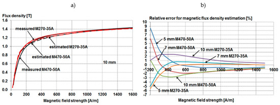 As can be seen from Figure 23, Figure 24, Figure 25, Figure 26, Figure 27 and Figure 28, the maximum relative error in estimating both the magnetization and loss characteristics for samples of various widths does not exceed 10%. In the case of the magnetization characteristics, it is the largest for small values of the magnetic induction. In the case of the induction commonly occurring in the core of the electric machine (most often exceeding 1.2 T), this error does not exceed 2%. In the case of the loss characteristics, this error increases with the increase in both the induction and the width of the sample, but also in this case, for an induction of 1.6 T, it does not exceed 10% for 50 Hz and 12% for 2000 Hz. The presented figures show that better estimation accuracy is obtained for the sheet M270-35A of lower thickness. We observe this for both the magnetization characteristics and the loss characteristics.