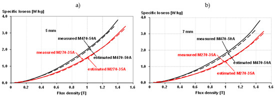 Measured (solid) and calculated (dashed) the specific losses of a sample 5 mm (a) and 7 mm (b) wide, punched with a die made of M470-50A and M270-35A sheets for a frequency of 2000 Hz.