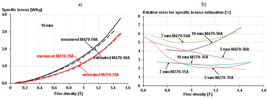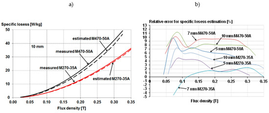 Measured (solid) and calculated (dashed) the specific losses of a sample 10 mm wide, punched with a die made of M470-50A and M270-35A sheets for a frequency of 2000 Hz (a) and relative error for the specific losses estimation (b).