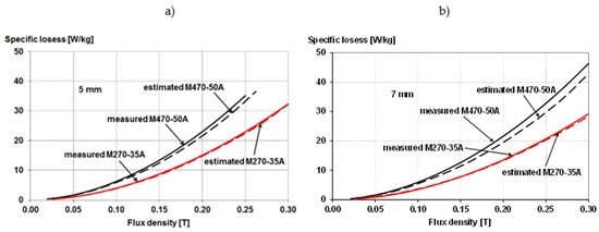 Figure 12 shows examples of the measured average for all angles of the specific losses’ characteristics of the M470-50A sheet with a thickness of 0.5 mm for samples cut with a guillotine of different widths for frequencies of 50 Hz and 2000 Hz.