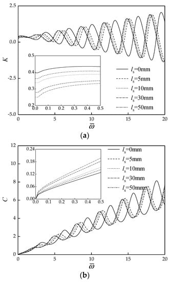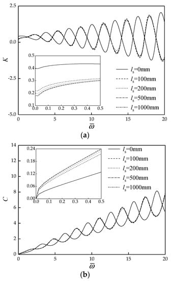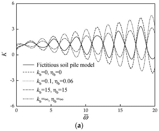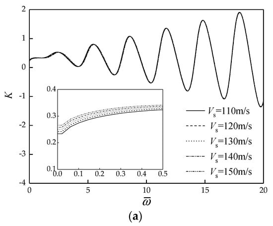 The effect of the PES properties on the vertical dynamic impedance of pile is systemically investigated in this section. Unless otherwise stated, the parameters of the pile–soil system are set as: the length, radius, density and elastic longitudinal wave velocity of the pile are 15 m, 0.5 m, 2500 and 3800 , respectively; the density, shear wave velocity, Poisson’s ratio and viscoelastic damping coefficient of PSS are 1800 , 180 , 0.4 and 1000 , respectively. The stiffness constant of the Voigt model between the adjacent soil layers is set as the elastic modulus of the lower soil, and the damping coefficient is set to 10,000 [].