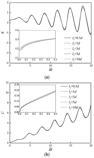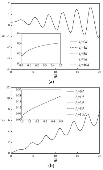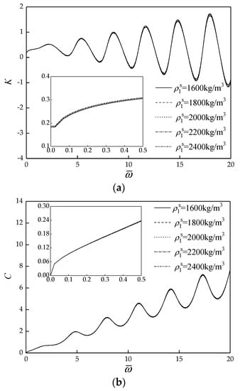 When analyzing the effect of PES density on the vertical dynamic impedance of pile, the thickness, shear wave velocity, Poisson’s ratio, viscous damping coefficient and density of PES are , 220 , 0.35, 1000 , and , respectively.