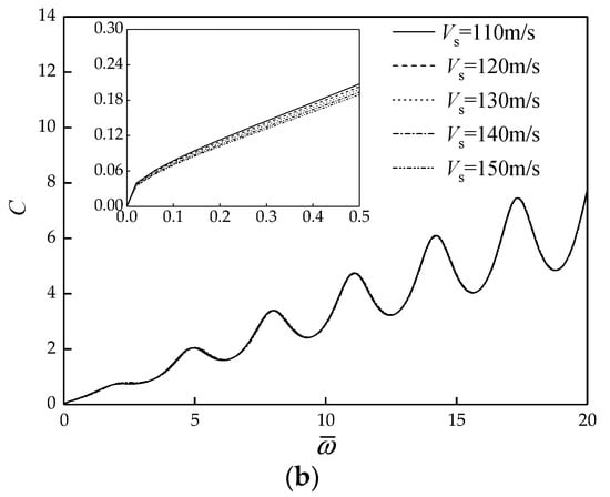 When discussing the effect of PES shear wave velocity on the vertical dynamic impedance of pile, the density, Poisson’s ratio, viscous damping coefficient, thickness and shear wave velocity of PES are set to 2000 , 0.35, 1000 , and , respectively.