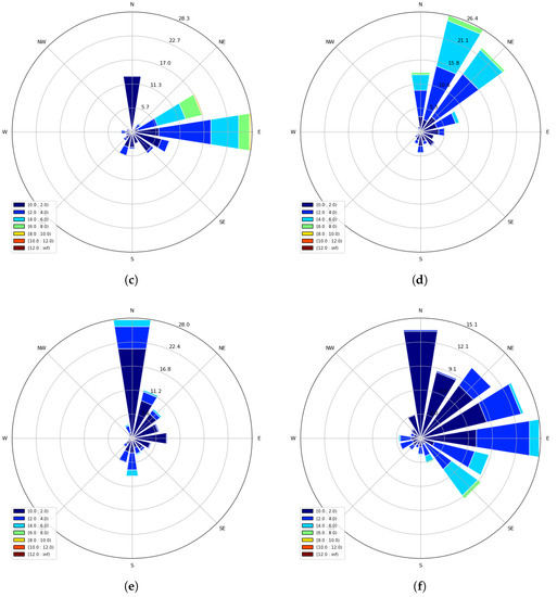 Wind direction and speed frequency at 10 m at each location. (a) Faaa. (b) Tautira. (c) Mahina. (d) Afaahiti. (e) Vairao. (f) Papara.