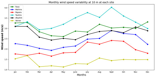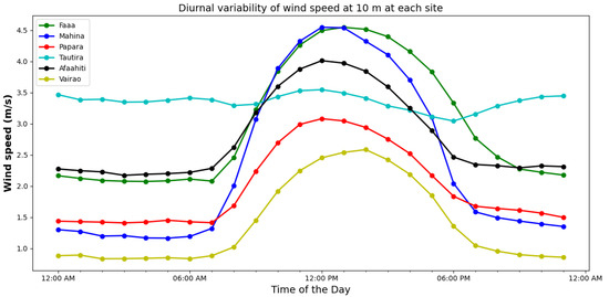 Monthly averages of wind speed at each location are shown in Figure 3. There is no clear seasonal cycle signal in the wind speed. The wind speed is clearly lowest in Vairao, where it remains less than 1.5 m/s all year round, followed by Papara and Mahina. The wind speed in Afaahiti is slightly lower than that in Faaa for every month except November. From March to November, the strongest wind is observed in Tautira, but during the months of December, January and February the wind in Tautira is similar to or slightly less than that in Faaa. Tautira displays a wind speed higher than 3 m/s except in December. In Faaa, wind speed is higher than 3 m/s from August to February. Hourly values of wind speed are plotted in Figure 4 to show the diurnal variation. The land/sea breeze circulation is apparent at each site, except in Tautira where the wind speed is more or less constant over the twenty-four hours, possibly due to the relatively strong and consistent trade winds. The daytime/nighttime contrast is the largest in the case of Faaa and Mahina. Indeed, from 9 a.m. until around 6 p.m. the wind speed is higher in Faaa and Mahina than in Tautira; in Faaa and Mahina it drops by a factor of 2 to 3 outside of these hours. In terms of WPD this would mean a drop by a factor of 8 to 27 outside of the range 9 a.m to 6 p.m. According to Figure 3 and Figure 4, Tautira, and to a lesser extent Faaa, display the highest wind resource in Tahiti.