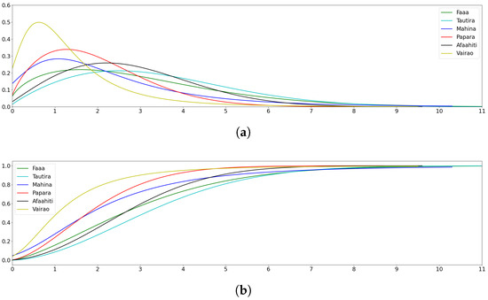 The Weibull PDFs and CDFs are shown in Figure 5a,b, respectively. Weibull PDFs are used to predict the fraction of time for which a given wind speed occurs at a given location. The peak of the Weibull PDF curve indicates the most frequent speed. The most frequent wind speed observed in Faaa is 1.7 m/s, compared with 2.5 m/s in Tautira. Afaahiti’s most frequent wind speed is 2.2 m/s, which is higher than that in Faaa. However, a close look at Figure 5b reveals that strong winds are not as frequent in Afaahiti as in Faaa. We assessed the agreement between the Weibull PDF and the observed data by computing the MSE, and found very low values at every location, of the order of . We performed two separate analyses: in the first one, we considered all stations for a period of 5 years (2016–2020); in the second one, we considered Faaa and Tautira over 13 years (2008–2020). There is strong interannual variability at play in the South Pacific, due to the El Nino Southern Oscillation (ENSO). Thus, we used a Wilcoxon’s test to compare the means of both 5-year-long and 13-year-long time series of Faaa and Tautira. They are significantly different at the confidence level of 95%. We are aware that longer time series for Mahina, Papara, Afaahiti and Vairao would be needed to properly compare all the stations, given that ENSO has an impact on local wind circulation around the island. We kept thirteen years of data for Faaa and Tautira in order to maximize the robustness of our results for these two locations.