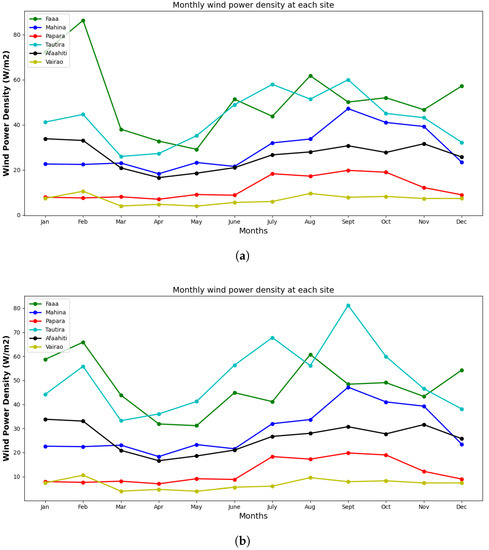 Monthly variation in 10 m WPD. (a) Monthly WPD considering the 2016–2020 period for all stations. (b) Monthly WPD considering the 2016–2020 period for four stations and 2008–2020 for Faaa and Tautira.