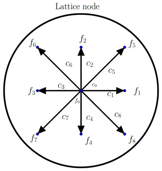 where is the collision operator and represents the collision between molecules. In the LBM, velocities are discretized using a predefined set of directions of propagation for molecules. A 2D example is given in Figure 1. Distribution functions are discretized according to these sets, giving the discrete partial distribution functions . The method is implemented on a Cartesian lattice with temporal and spatial mesh width and of size 1.