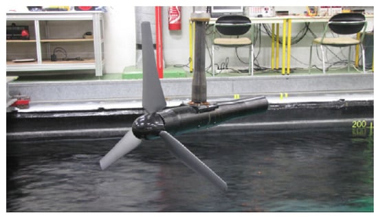 The experiment as reference is the one of Mycek et al. []. He studied the wake and performances of a three-bladed tidal turbine model with two turbulent inflow conditions. The experiment has been carried out at Ifremer’s flume tank. The tidal turbine was developed by Ifremer and is illustrated in Figure 3. It is placed in the middle of the tank and the blockage ratio is approximately .