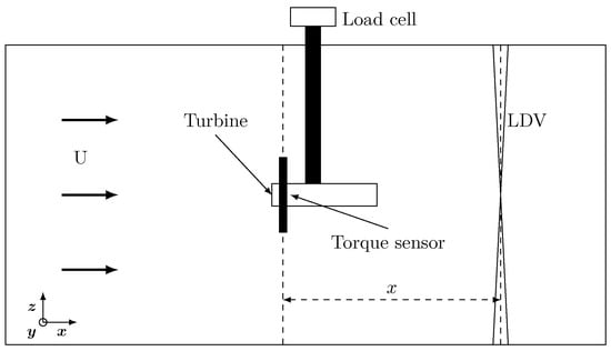 The axial force is measured with a load cell placed at the fixing point of the turbine mast, so is the force applied to both stator and rotor. The torque is measured with a torque sensor located on the rotor axis. Wake measurements are made with laser Doppler velocimetry (LDV) and the frame origin is the rotor centre. The flow velocity and the location of the measurements x are presented in dimensionless units with and . The experimental set-up is presented in Figure 4.