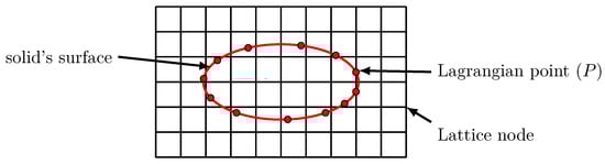 Boundary conditions for straight walls introduced in Section 2.1 are not adequate for modelling complex geometries like tidal turbines. Using such conditions would end with a staircase approximation of the surface and an inaccurate wake. The technique applied here is the immersed boundary method (IBM), which is well suited for modelling complex geometries []. The IBM was first introduced by Peskin [] for simulating blood flow in the heart. The first use of IBM in an LBM simulation was done by Feng and Michaelides []. In Palabos IBM-LBM, the solid surface is discretized into a set of Lagrangian points. There should be enough points to correctly describe the solid and the spacing between points should not be superior to . The IBM uses interpolations to compute the fluid velocity and density at each Lagrangian points P (Figure 5). Quantities are interpolated from lattice macroscopic quantities computed from pre-collision distribution functions. The solid boundary is modelled through a force acting on the fluid at the Lagrangian point’s location. The forcing method used in Palabos is based on []. The momentum at a Lagrangian point is written: