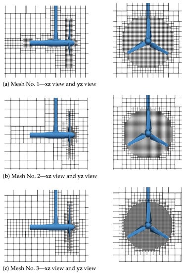 Meshes around the turbine are shown in Figure 7. Only the area swept by the rotor is refined at the finest level. Indeed, the flow around the blades is the area where the Reynolds number is the highest and where the boundary layer is the thinnest. The finest mesh volume for mesh No. 2 and 3 is much smaller than for mesh No. 1. After running simulations with mesh No. 1, it seemed impractical to use the same finest mesh volume for mesh No. 2 and 3. In order to lower the computational cost, considerable work has been done to lower as much as possible the number of nodes in the finest domain. Since convective scaling is used, all three cases are run with a constant Mach number of .