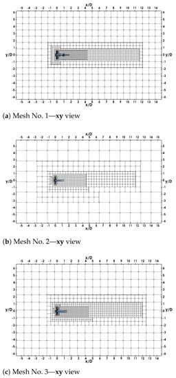 Mesh used in LBM-LES simulations of the tidal turbine []. Domain is centred at the rotor centre. (a): mesh No. 1 is represented in cubes of nodes. (b,c): mesh No. 2 and 3 are represented in cubes of nodes.