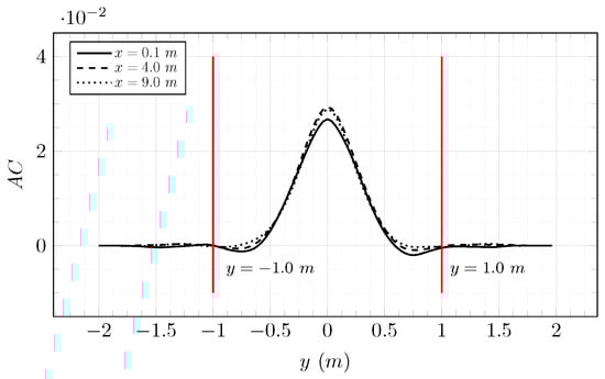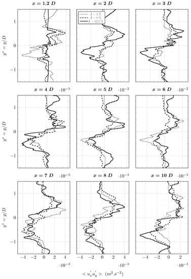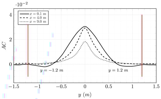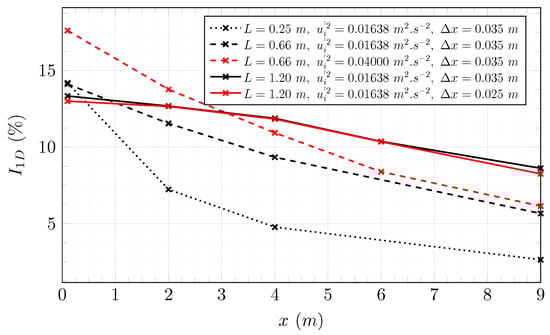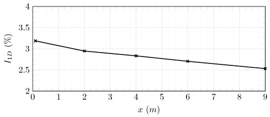Figure 10 shows the evolution of the turbulence rate according to the stream-wise direction. The turbulence rate is almost conserved along the flume tank. An autocorrelation function is used to compute the integral length scale of turbulent structures. This function is applied in the plane of normal at m and according to the direction . It is defined in Equation (17):