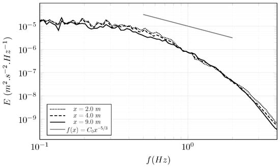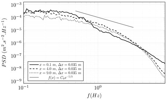 Turbulent flows are complex phenomena where coherent structures of several scales evolve. Large structures are the most energetic and energy goes from big structures to small structures. This energy cascade is observable with a power spectral density (PSD) calculated from a sampling of the velocity. The PSD from a developed turbulent flow has a slope of , characteristic of the energy cascade. The stream-wise velocity component is recorded at the centre of the flume at Hz in and m. The PSD calculated from this recording is plotted in Figure 12.