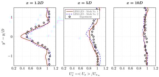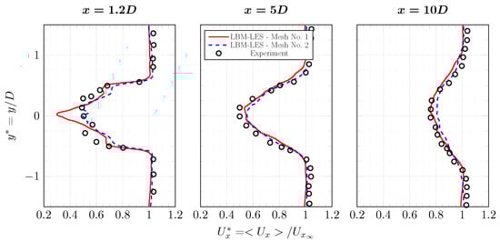 Average axial velocity profiles in the wake of the tidal turbine at and . Results are from experiment [] and from LBM-LES simulations with mesh Nos. 1 and 2. Complete profile set.