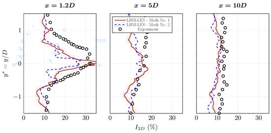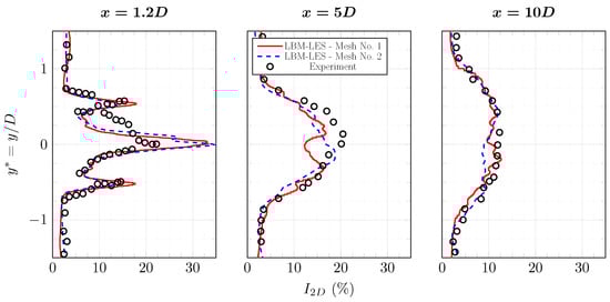 Average turbulence intensity profiles in the wake of the tidal turbine at and . Results are from experiment [] and from LBM-LES simulations with mesh Nos. 1 and 2. Complete profile set.