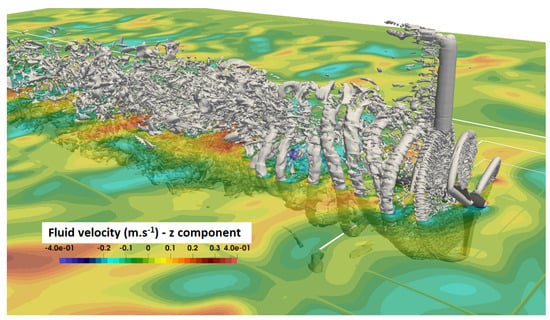 An LES approach is used and the subgrid model is a static Smagorinsky model []. It adds a turbulent viscosity calculated with Equation (4):