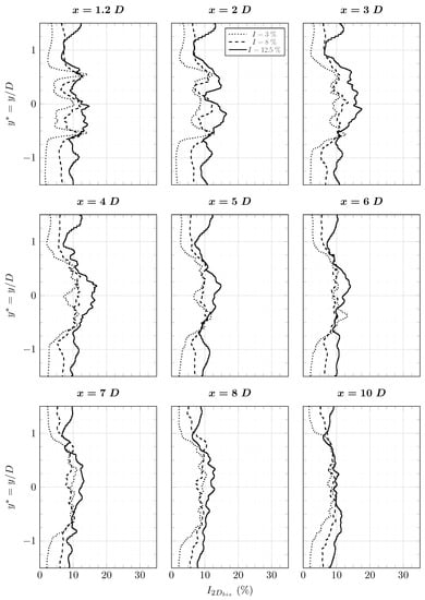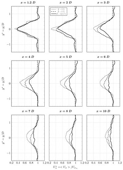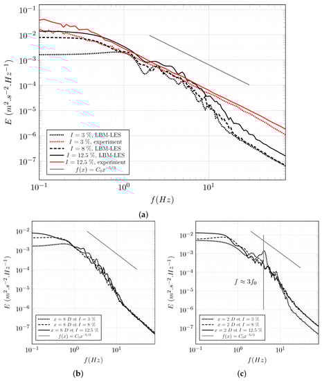 The DFSEM boundary condition is applied through the Dirichlet boundary condition of Palabos. The objective is to generate synthetic turbulence as close as possible to the turbulence of Mycek et al.’s [] experiment. In addition to the data provided by Mycek et al. [], an analysis of the upstream and downstream turbulence was made by Medina et al. []. The general definition of the turbulence intensity, noted I or , is based on the three components of the velocity fluctuations, and is given by Equation (14), where are the time-averaged velocity fluctuations and are the time-averaged velocity components. In addition, the stream-wise turbulence intensity is based on the velocity component in the current direction. Similarly, the two-dimensional turbulence intensity is based on the velocity fluctuation in the flow direction and in the transverse direction. The turbulence rates and are defined in equation Equations (15) and (16). Measured turbulence rate I, and were also provided by Ifremer. Depending on the source, the turbulence rate I is found between and for the case where no flow straighteners are used. According to those sources, the turbulence rate is constant in the stream-wise direction. When using a synthetic turbulent inflow condition, one should verify that the turbulence intensity is conserved over a long enough distance. Indeed, for a high turbulence rate, the artificial turbulent structures rapidly lose their intensity and the turbulence rate decreases according to the stream-wise direction. Accordingly, we choose to generate a flow with a turbulence rate of . This case is denominated “” from now on. When flow straighteners are used, the turbulence rate is close to . This value is kept for this study and this case is denominated “”.