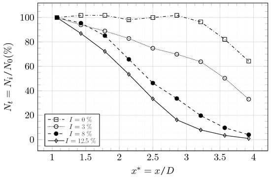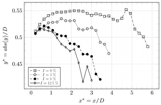 Figure 28 shows the distance from the intersections to the axis m. The height is averaged over m segments from m until . The height decreases faster as the turbulence increases. A higher upstream turbulence intensity thus increases the trend of tip-vortices to move toward the axis m. The low turbulence rate as a significant impact over and the evolution of for the cases with are close.