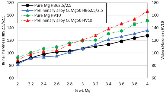 Mechanical properties of the obtained ingots were determined using two methods of hardness testing, i.e., Vickers and Brinell’s methods. For each, 10 indentations were made in the two halves of each ingot, the average values of which represented an accurate image of the materials’ mechanical properties. The obtained values and their standard deviations are presented in Figure 1. Brinell’s method is marked with a full line and the Vickers method is marked with a dotted line. In terms of alloy additives, pure Mg is marked with circles and preliminary alloy CuMg50 is marked with triangles. Concerning the repeatability of the measurements, it may be stated that the obtained values do not differ much, as the standard deviations presented by error bars are barely visible; the standard deviation was calculated to be between 0.3 and 0.8 for Brinell’s method and between 1.1 and 3.7 for the Vickers method.