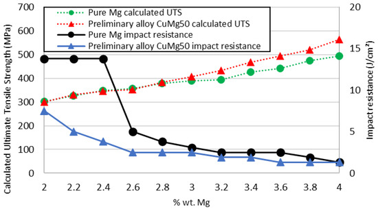Using the equation proposed by Cahoon [43], the obtained Vickers hardness values, after converting from kgf/mm2 to Si units, were recalculated to obtain the anticipated UTS values (dotted lines). These are presented in Figure 2 with the obtained impact resistance values (full lines) of the CuMg alloys.