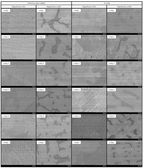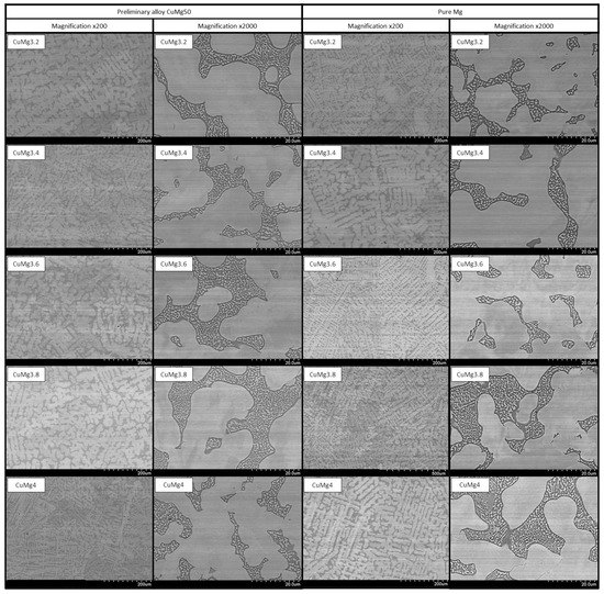 Backscatter electron SEM analysis of CuMg alloys in the as-cast state obtained with preliminary alloy CuMg50 (on the left) and pure Mg (on the right) with two magnifications (200× on the left and 2000× on the right); the analyzed chemical composition of the alloy is marked on each of the images.