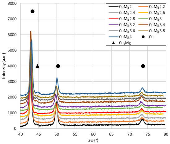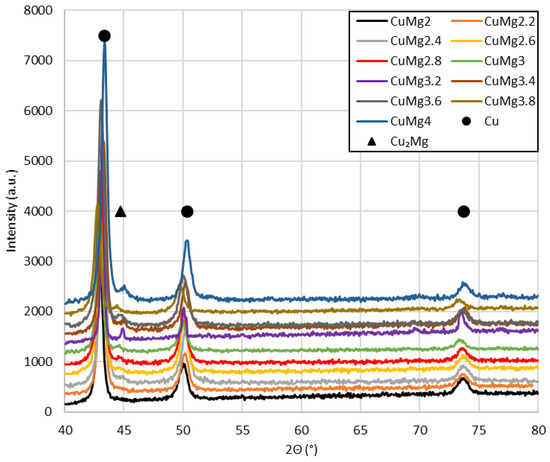 The X-ray diffraction patterns for the CuMg ingots obtained with pure Mg in the as-cast state with the marked peaks.