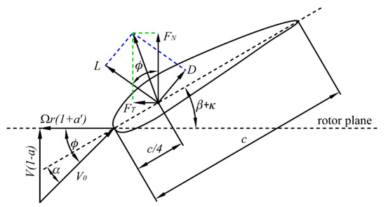 According to the theory of blade element momentum (BEM) [43,44], the aerodynamic load acting on the blades can be obtained. In the BEM, the blades are assumed to be discretized into small elements which are independent of adjacent elements. The transversal section of one element with its chord length and the aerodynamic forces on it are shown in Figure 2.